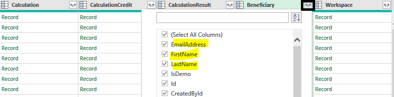 Each CalculationCommission record refers to other tables. For example, each CalculationCommission record points to a payee within the SystemUser table (via its BeneficiaryId field). Our goal is to retrieve payee email addresses and first/last names. To retrieve fields from related tables, choose this option.