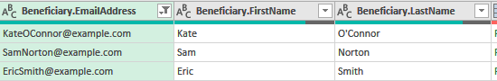 To pull fields from related records, all we have to do is click on the “split arrow” icon. This allows us to expand the related record, and select fields from it. Below, we expanded the Beneficiary linked record to grab its email address and first/last name.