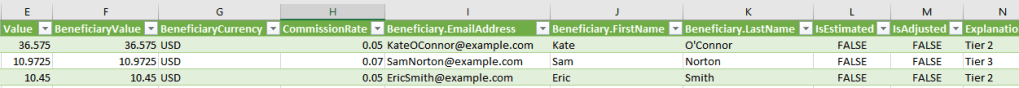 Here are the first 3 rows of our loaded spreadsheet (with fields from the CalculationCommission and related table). Now we can clearly analyze who got paid what.
