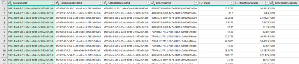 Here is what our CalculationCommission table looks before transformation. As you can see, some of the fields, such as Value, have actual data (here Value means payout). Other fields look more like IDs because they reference other tables.
