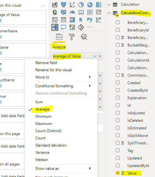 Next, select the metric to analyze. Here, we’ll select the average value from table CalculationCommission. This table stores per-transaction payouts, and the value is the payout.