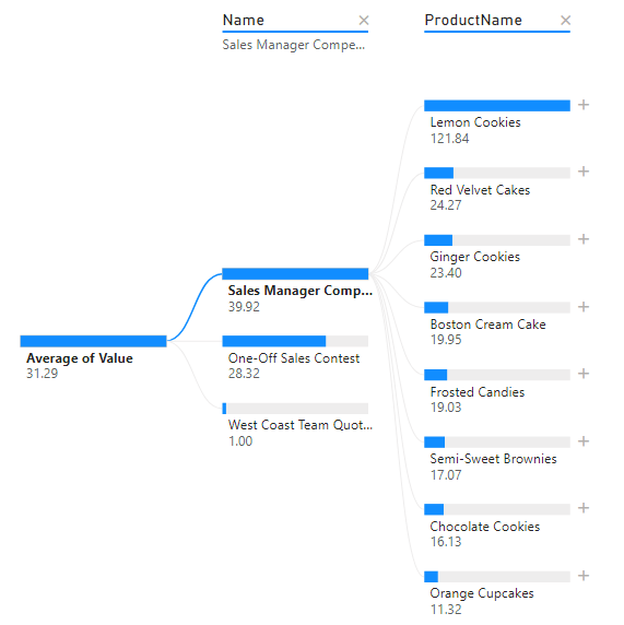 We can now expand the Decomposition Tree based on “high value” impact. The algorithm finds which criteria is the most meaningful, in terms of yielding higher payouts. We can see that the customer name is the #1 most significant factor (the average per-transaction commission amount is $111.95 for “Candy Fancy Inc.”). Then, the #2 most significant factor is the product name (the average per-transaction commission amount is $506.99 for “Lemon Cookies”) . Finally, the #3 factor is the plan name.