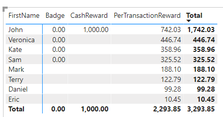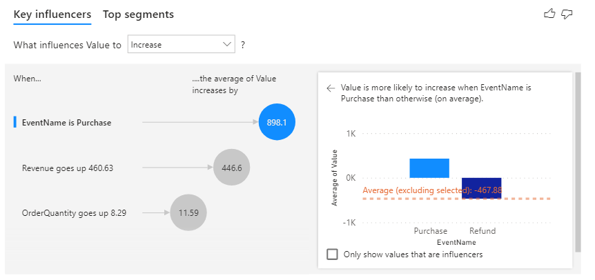 Let’s try a different but related type of analytics – key influencers. Below, we can see how certain fields impact the amount credited to rep (for quota retirement). The event name (purchase vs. refund) appears to be a key influencer. No big surprises here. Other influencers are revenue and order quantity.