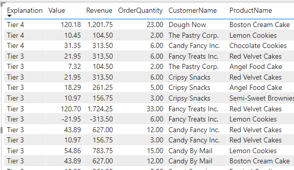 Here is some really cool advanced analytics! We want to know what might be causing a slight trend of decreasing credited revenue. It looks like sales to customer “Fancy Treats” has something to do with this downward trend. To get this visualization, all we had to do is a/ plot credited revenue by date, b/ add a trend line, and c/ ask Power BI to explain the trend.