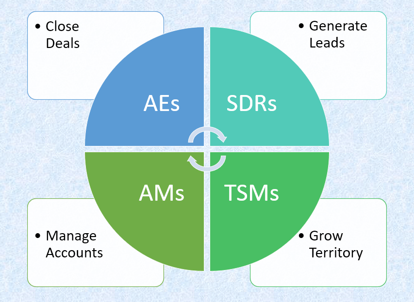 AEs are responsible for assessing needs, closing opportunities, answering questions from customers, and facilitating the sales process. They represent the bulk of the workforce. They have a “close deals” function.