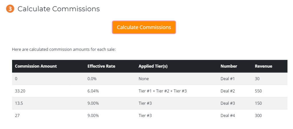 Intuitively, Deal #2 will cross multiple tiers. A portion of its $550 will be paid at 0%, a portion at 5%, a portion at 7%, a portion at 9%. This means a blended commission rate. This is very difficult to calculate, especially if you have a lot of deals. Enter our free calculator which does this automatically for you. Internally, our calculator knows how to split the single $550 amount into portions, and apply the relevant tier percentage to each portion.