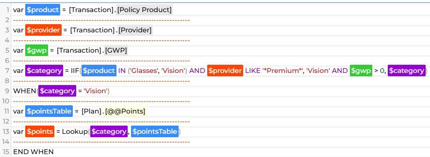 You can also apply rules to categorize policies based on certain fields. In the example below, we’re looking for certain keywords to classify a policy as “Vision”. We then lookup a number of points from a lookup table which can change over time.