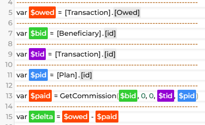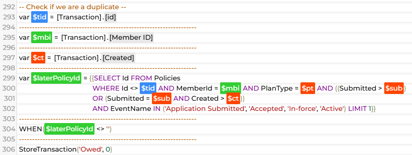 Using Sales Cookie, we can implement commission true-up logic. Each time, we will re-process ALL policies in your system, and calculate the difference between a/ what is owed (based on the latest facts) and b/ what has been paid (based on our “memory” of commissions). This true-up system is very useful when dealing with ever changing (corrected) insurance policy data. In the example below, we’re calculating the difference between what is owed and what has been paid so far to issue a true-up amount.
