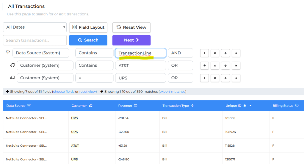 Perfect, we got NetSuite data into Sales Cookie. Sales Cookie provides an extremely powerful, unified data store capable to spanning across multiple data source (ex: NetSuite invoices + NetSuite vendors + CSV data + Snowflake data). In this example, we are only querying for NetSuite transaction line records whose customer contains “AT&T” or is equal to “UPS”. We can also build data filtering scripts to only select relevant data for commission calculation purposes.